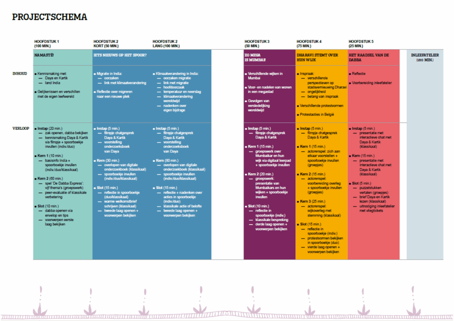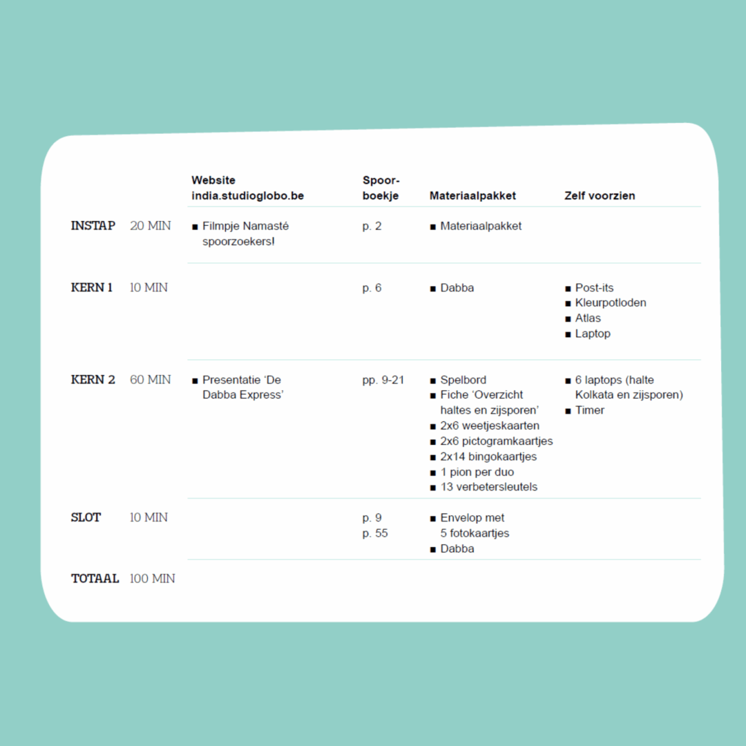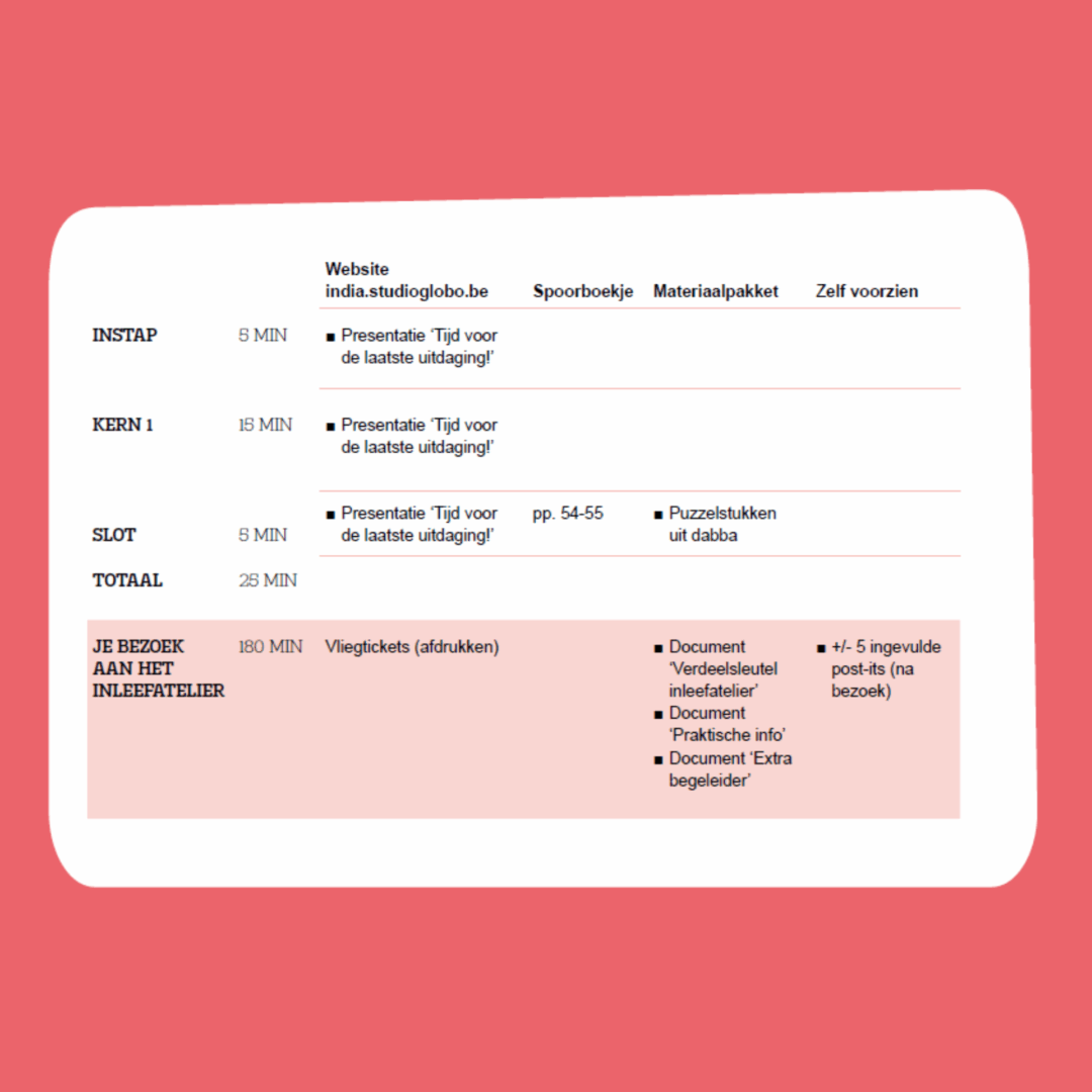 Het project De wereld in je klas: India bestaat uit vijf hoofdstukken en het inleefatelier te Roeselare.