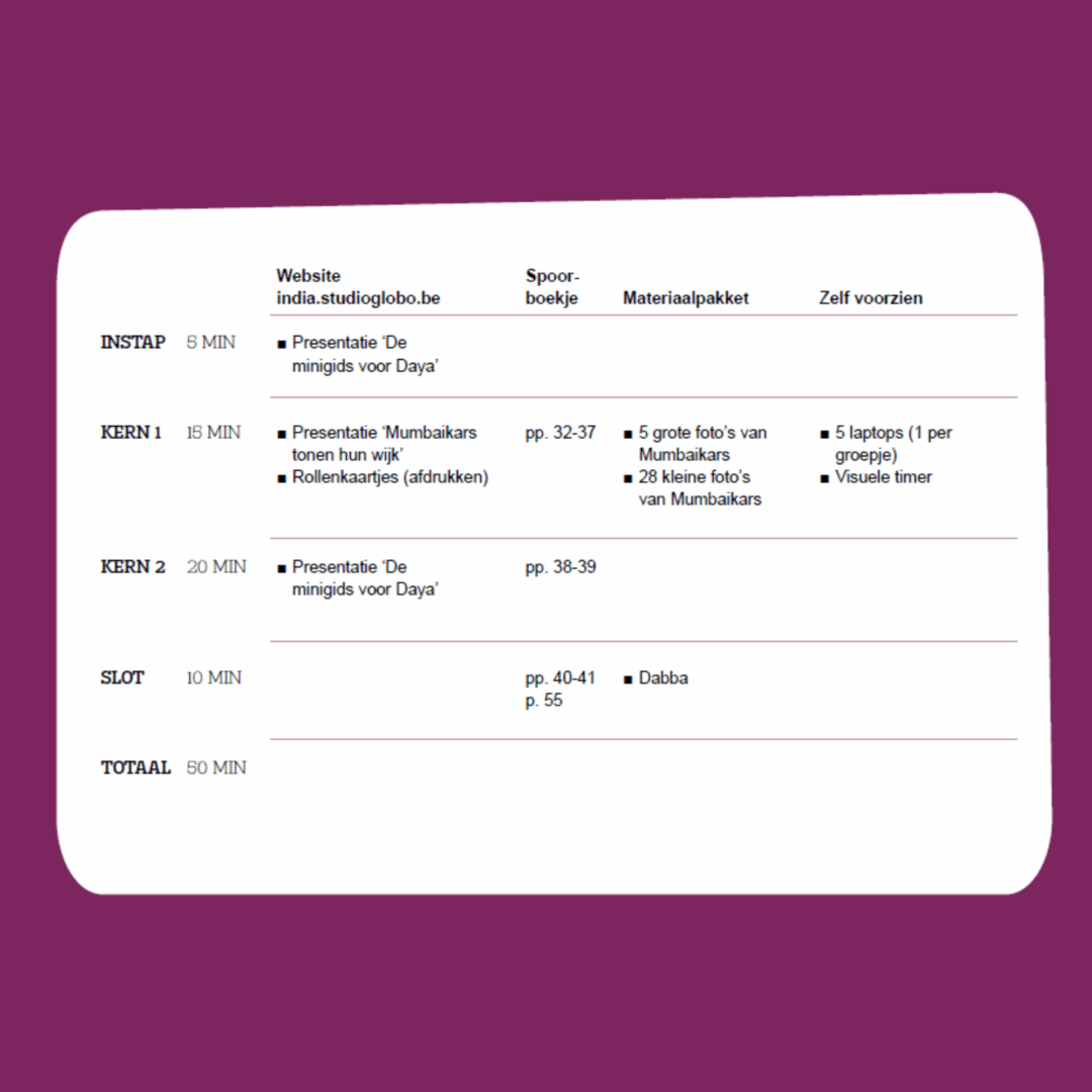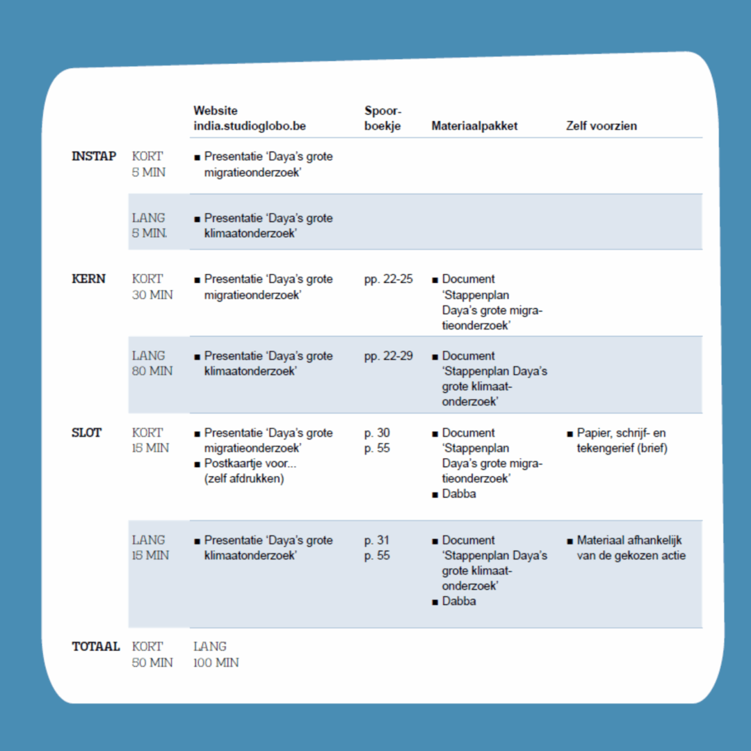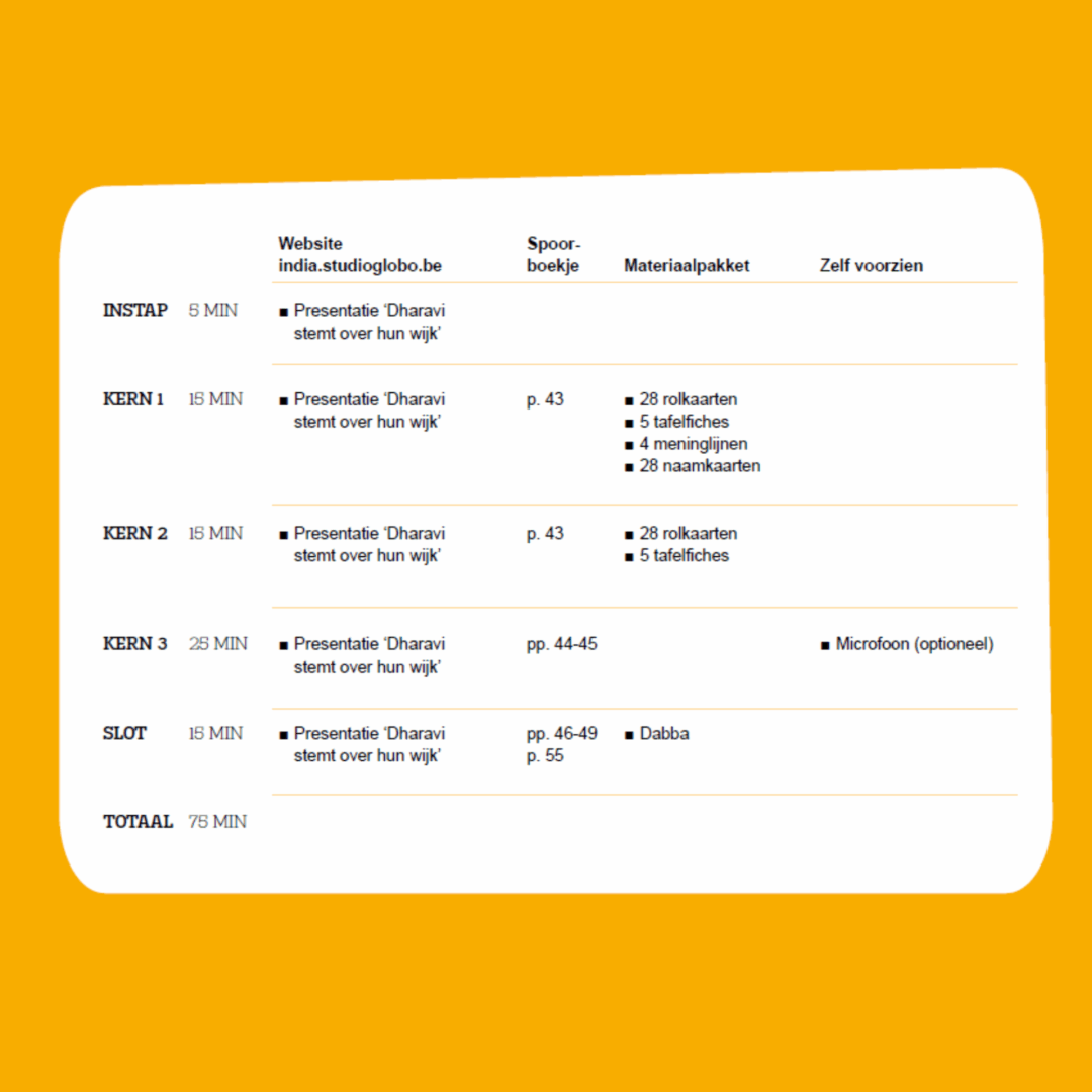 Het project De wereld in je klas: India bestaat uit vijf hoofdstukken en het inleefatelier te Roeselare.